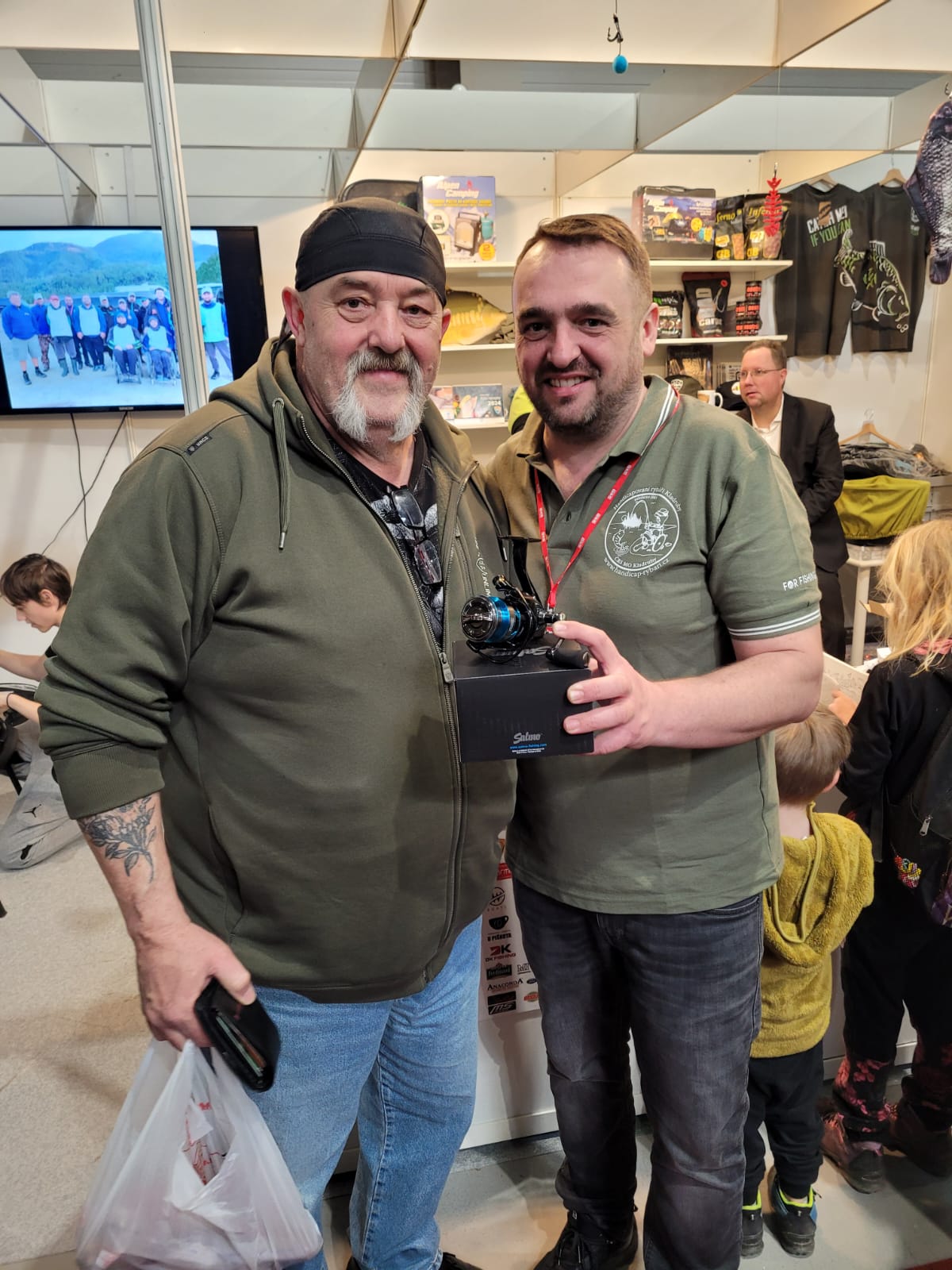 Statutární zástupci ČRS předseda Karel Mach a jednatel Roman Heimlich na stánku handicapovaných rybářů na veletrhu For Fishing 2024